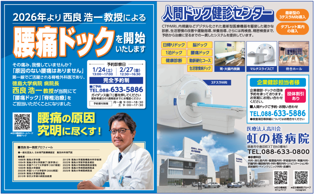 西良先生が病院長を務める徳島大学病院には、国内外のアスリートをはじめ、多くの患者さんが腰痛治療を求めて受診されており、このたび当院で診療を担当していただけることは、地域の皆様により質の高い医療を提供できる機会になると考えております。